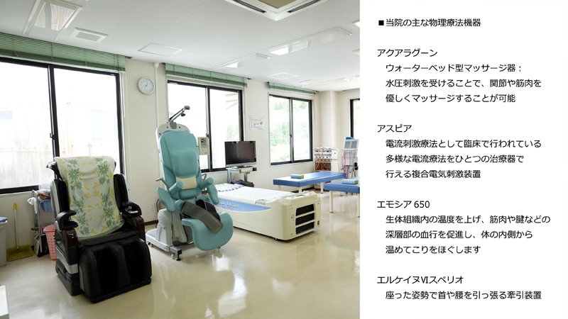 当院では、様々な物理療法機器でリハビリや、あんまマッサージ指圧師によるマッサージを受けることが出来ます。
